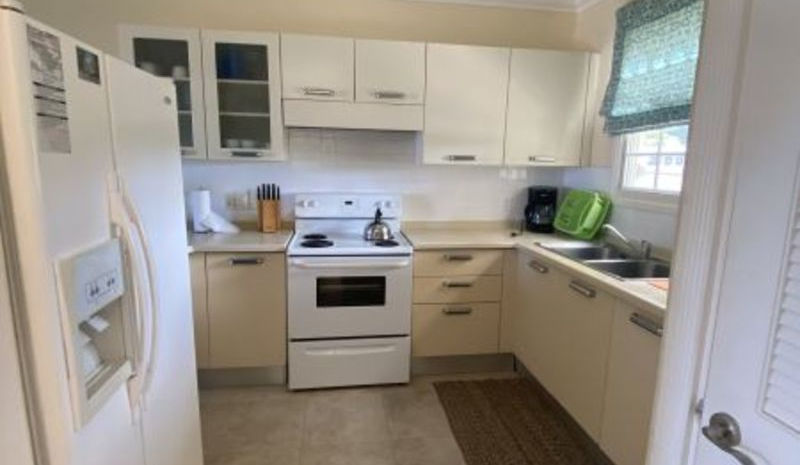 Vuemont 237 is a charming 2-bedroom 2-bathroom, unfurnished condo for sale in Barbados. The property is located in the lovely Vuemont community on the West Coast of Barbados. It offers a fully equipped kitchen, open living and dining areas, that lead on to a large covered patio. The patio has a table with chairs and 2 loungers, perfect for relaxing while enjoying the views of the lush tropical landscaping.